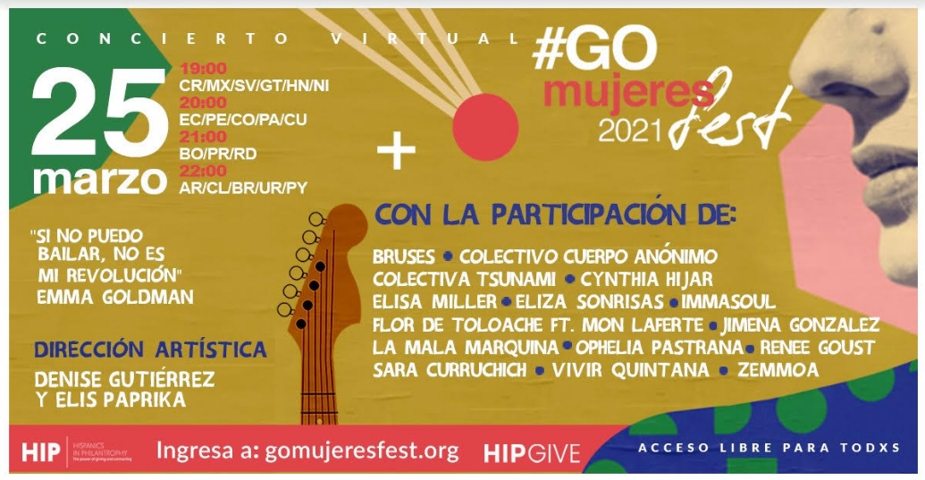 HIPGive es una ONG con más de 30 años de experiencia luchando por la igualdad en el continente americano, que cada año realiza una campaña de recaudación de fondos y para esta edición 2021 se presentara el concierto virtual #GOMujeresFest2021 el próximo 25 de marzo. El evento cuenta con la dirección artística de Denise Gutiérrez (Hello Seahorse!) y Elis Paprika.