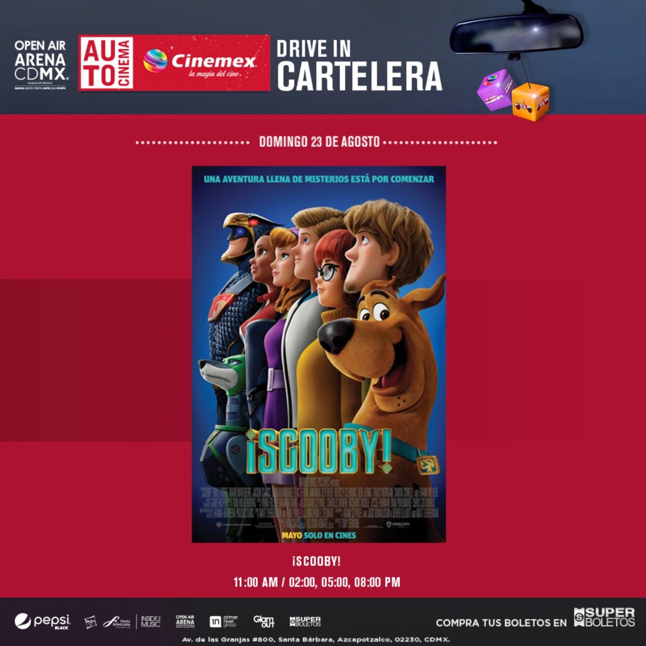 El Autocinema Cinemex Open Air Mx se encuentra en la Arena Ciudad de México, ubicada en Av. de las Granjas 800, Santa Bárbara, Azcapotzalco en la Ciudad de México y este Domingo 23 de Agosto proyectará el estreno de la película “¡Scooby!” a las 11am, 2pm, 5pm y 8pm con boletos disponibles ya a la venta en el Sistema Superboletos.
