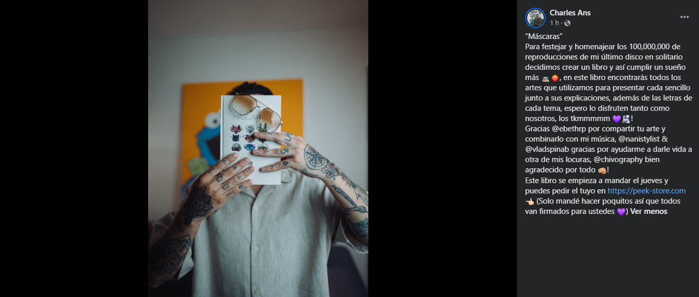 Recientemente, Charles Ans compartió emocionantes noticias en sus cuentas oficiales: la publicación de un libro que revela el proceso creativo detrás de cada una de estas obras de arte, además de incluir las letras de todas las canciones del álbum. Este anuncio llega en un momento especial, ya que Charles celebra haber alcanzado la increíble marca de 100,000,000 reproducciones con su álbum «Máscaras».
