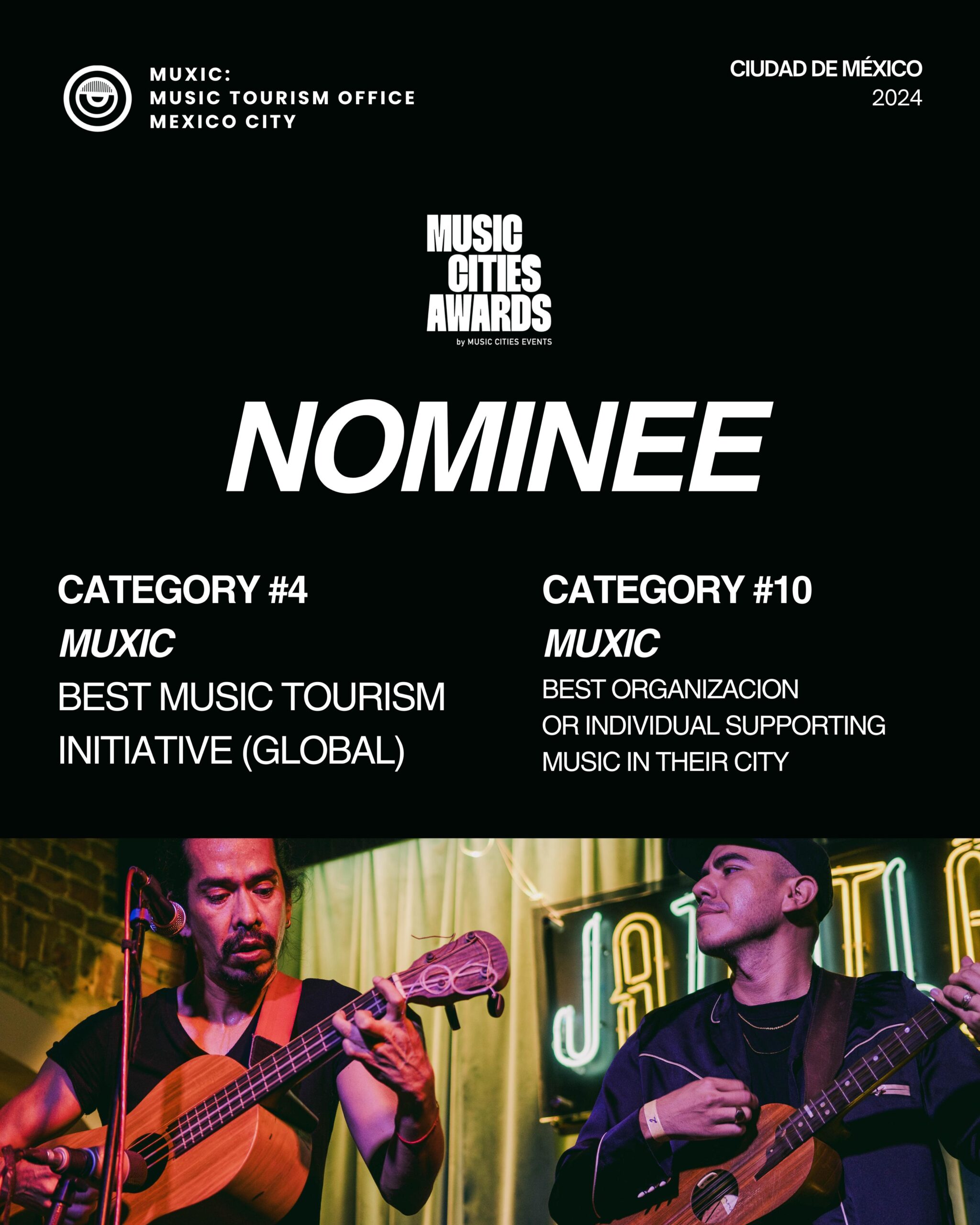 La Ciudad de México recibió dos nominaciones en los Music Cities Awards gracias a MUXIC: Oficina de Turismo Musical de México. Las categorías son las siguientes: