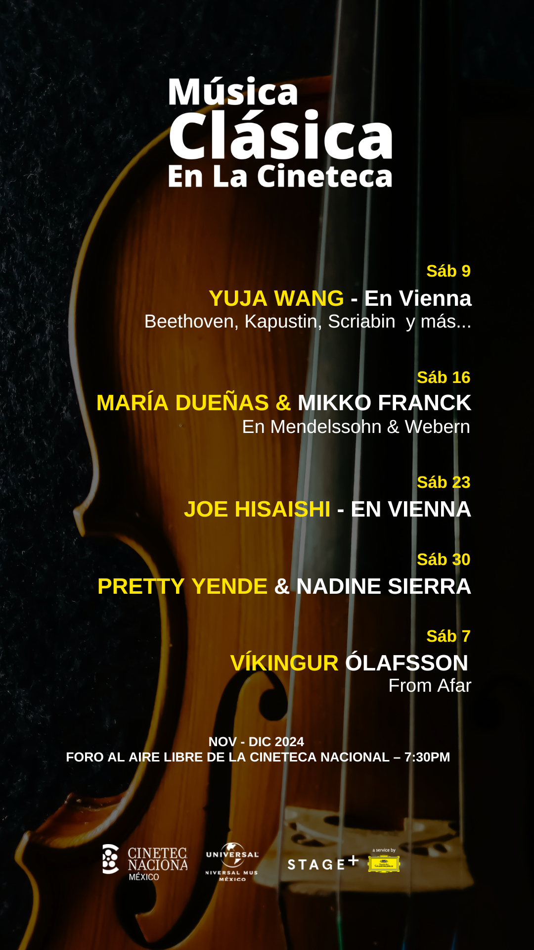 Deutsche Grammophon y Universal Music México, en colaboración con la Cineteca Nacional, anuncian el primer ciclo de música clásica que incluirá las proyecciones de conciertos presentados por el servicio de streaming de Deutsche Grammophon, STAGE+, de artistas de talla mundial como Víkingur Ólafsson, María Dueñas, Yuja Wang, Pretty Yende & Nadine Sierra y Joe Hisaishi.