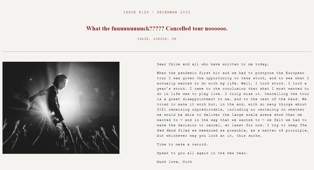 Desde hace años, Nick Cave ha sido una especie de gurú no sólo musical, sino de la vida misma. Durante este periodo de pandemia y encierro, muchos de sus fans recurrieron a él para obtener palabras de aliento y siempre respondió de la mejor manera.