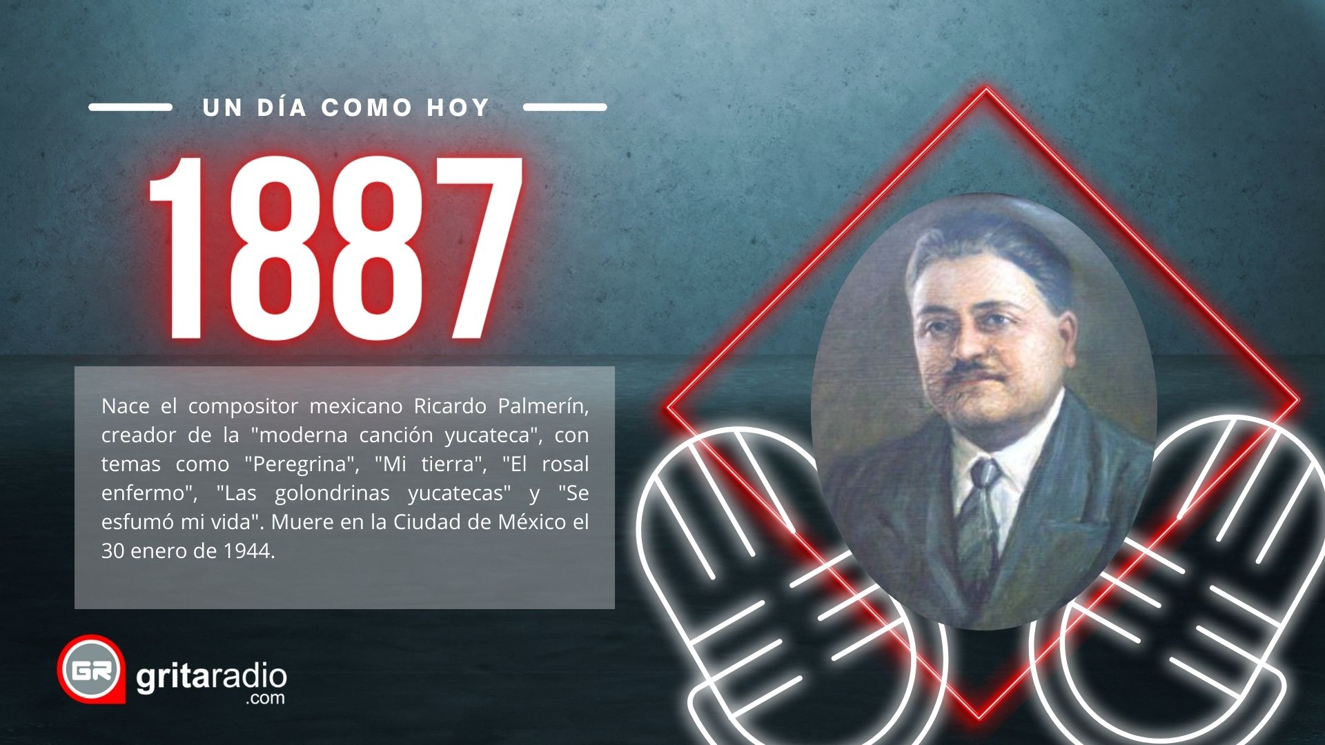 1887.- Nace el compositor mexicano Ricardo Palmerín, creador de la «moderna canción yucateca», con temas como «Peregrina», «Mi tierra», «El rosal enfermo», «Las golondrinas yucatecas» y «Se esfumó mi vida». Muere en la Ciudad de México el 30 enero de 1944.