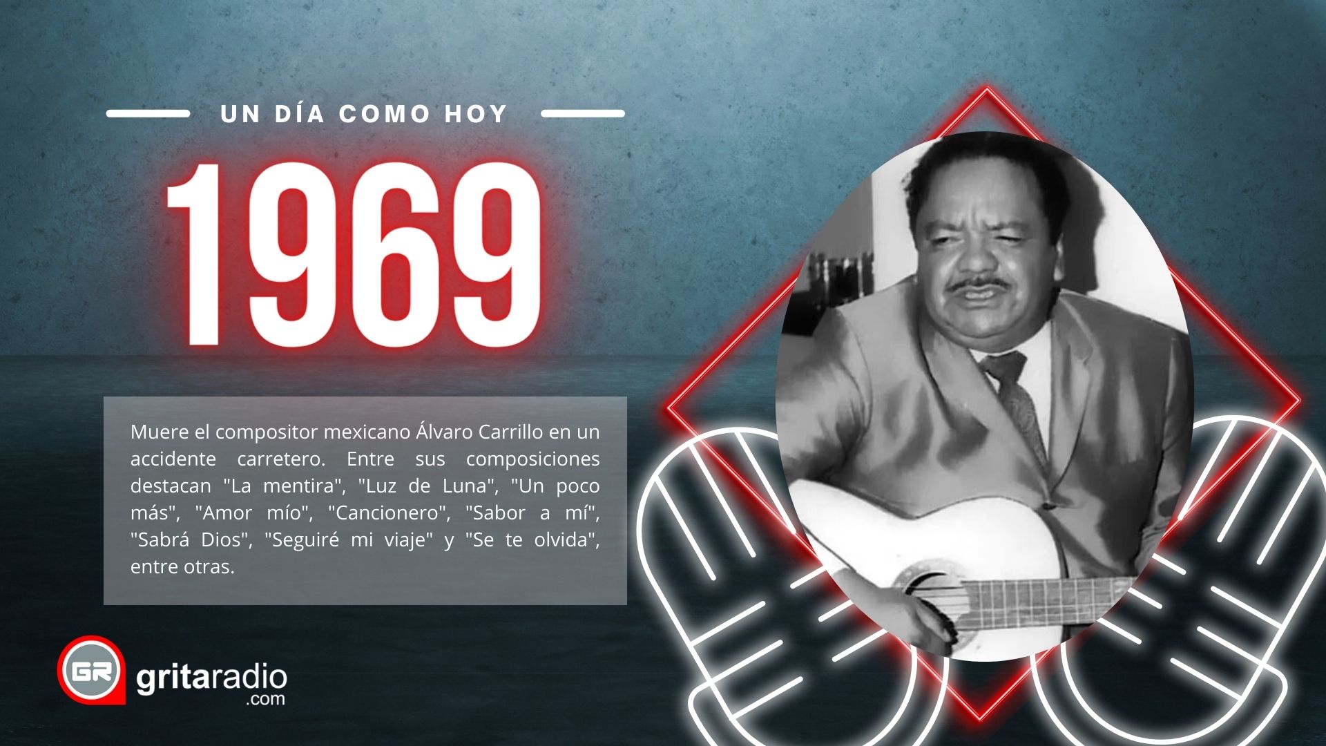 1969.- Muere el compositor mexicano Álvaro Carrillo en un accidente carretero. Entre sus composiciones destacan «La mentira», «Luz de Luna», «Un poco más», «Amor mío», «Cancionero», «Sabor a mí», «Sabrá Dios», «Seguiré mi viaje» y «Se te olvida», entre otras. Nace el 2 de diciembre de 1919, en Cacahuatepec, Oaxaca.
