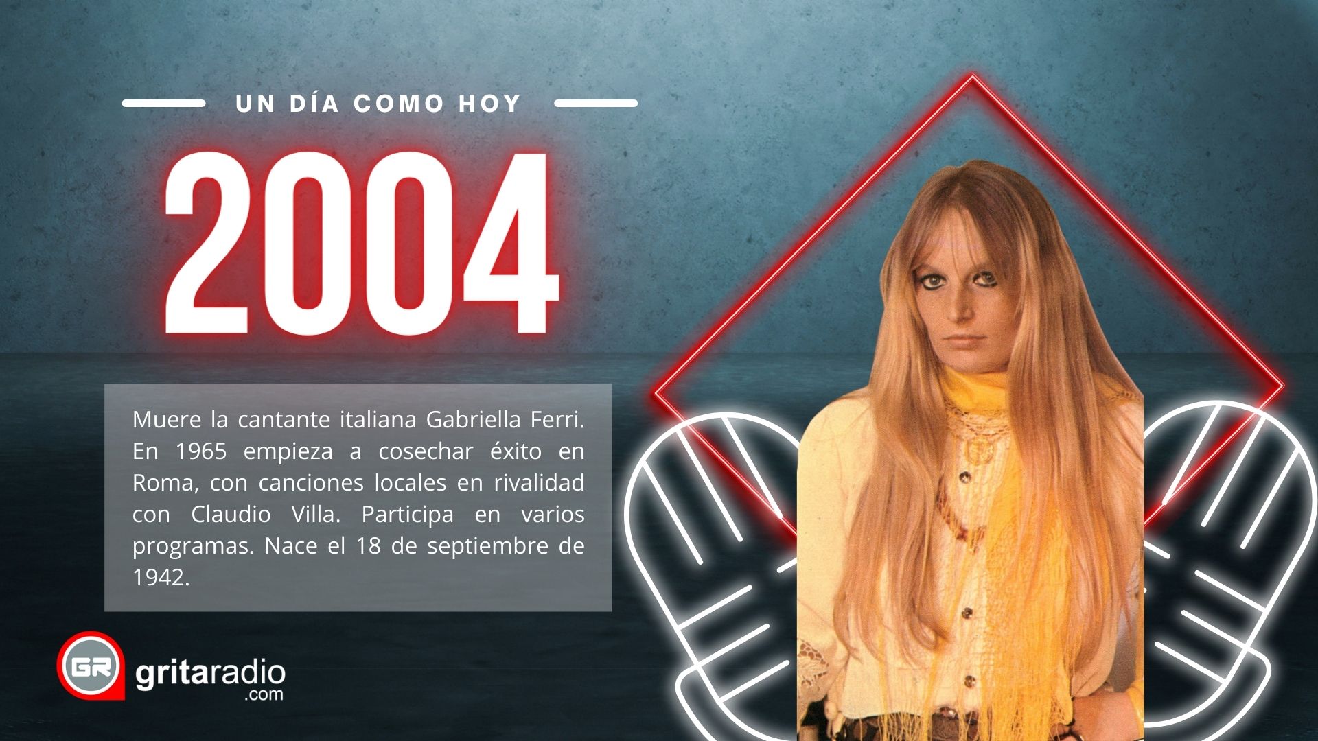 2004.- Muere la cantante italiana Gabriella Ferri. En 1965 empieza a cosechar éxito en Roma, con canciones locales en rivalidad con Claudio Villa. Participa en varios programas. Nace el 18 de septiembre de 1942.