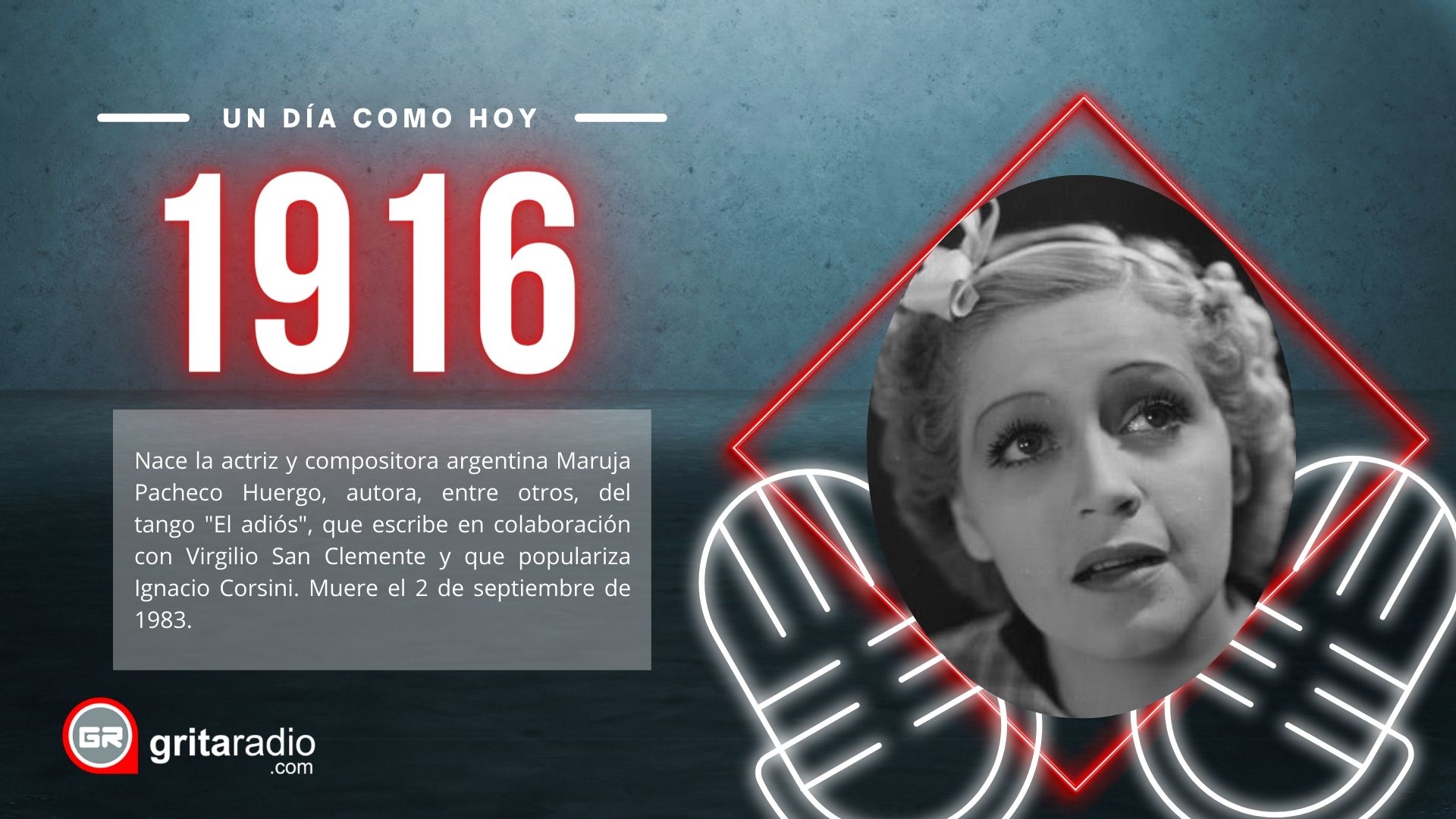 1916.- Nace la actriz y compositora argentina Maruja Pacheco Huergo, autora, entre otros, del tango «El adiós», que escribe en colaboración con Virgilio San Clemente y que populariza Ignacio Corsini. Muere el 2 de septiembre de 1983.