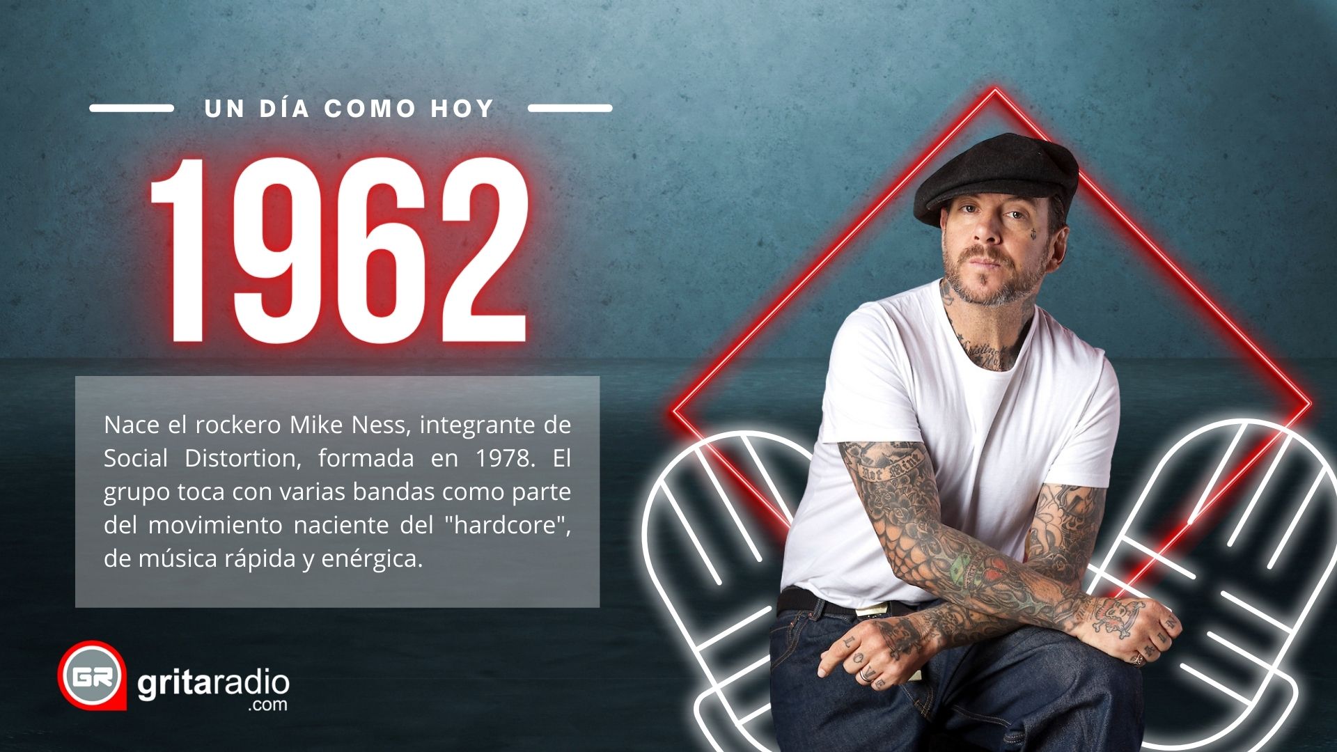 1962.- Nace el rockero Mike Ness, integrante de Social Distortion, formada en 1978. El grupo toca con varias bandas como parte del movimiento naciente del «hardcore», de música rápida y enérgica.
