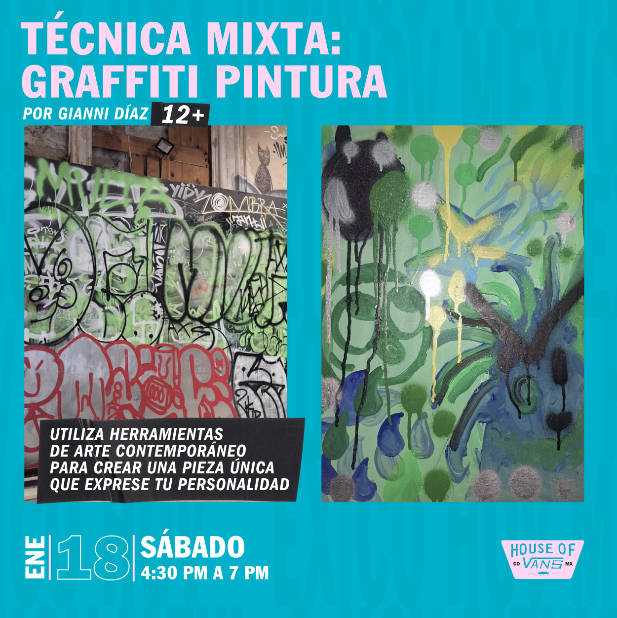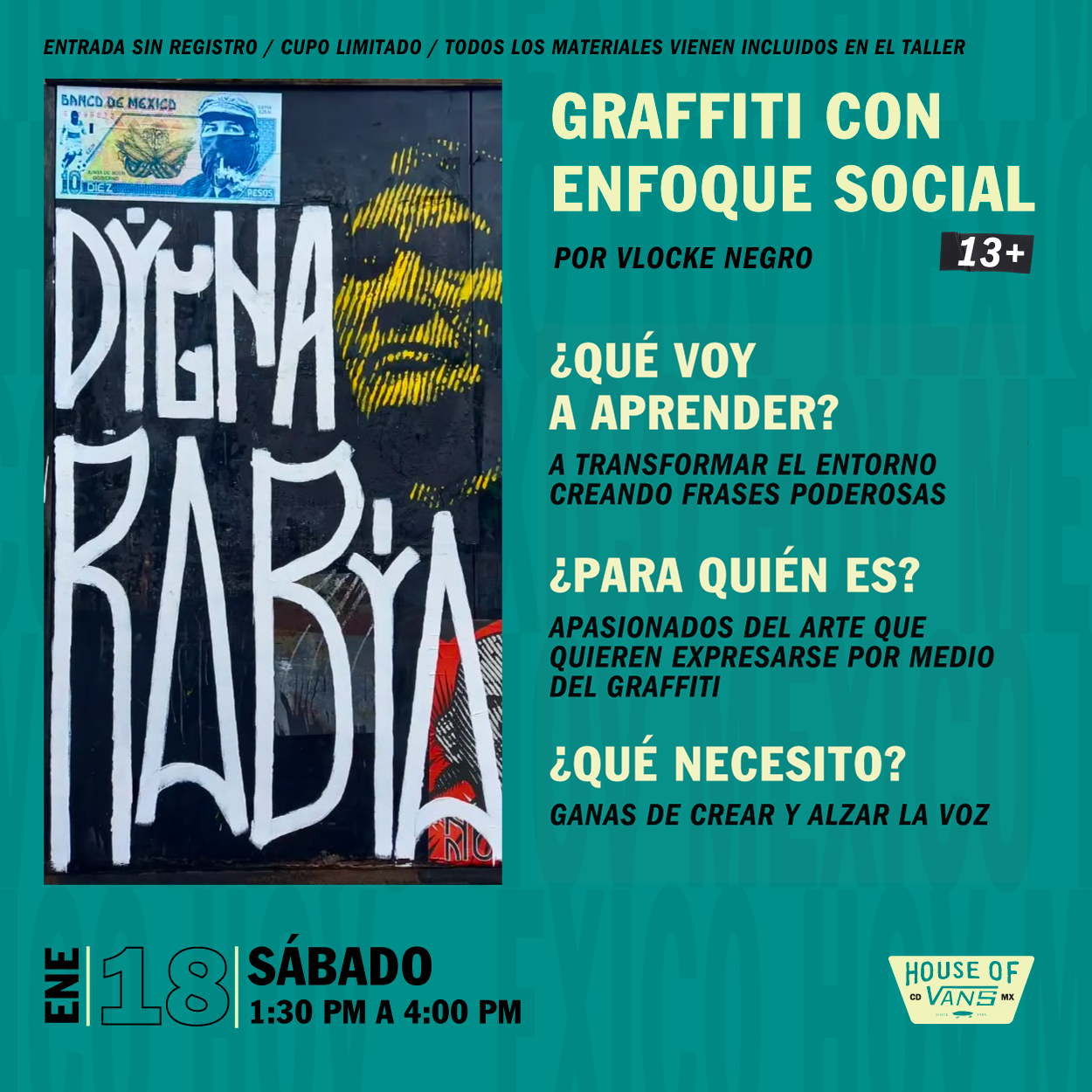 El mismo 18 de enero, podrás aprender sobre el trasfondo de los graffitis con el curso «Graffiti con enfoque social» impartido por Vlocke Negro; y también, podrás aprender a pintar graffitis con una técnica mixta que incluye la pintura impartido por Gianni Díaz. Para ambos eventos la entrada es libre y con cupo limitado.