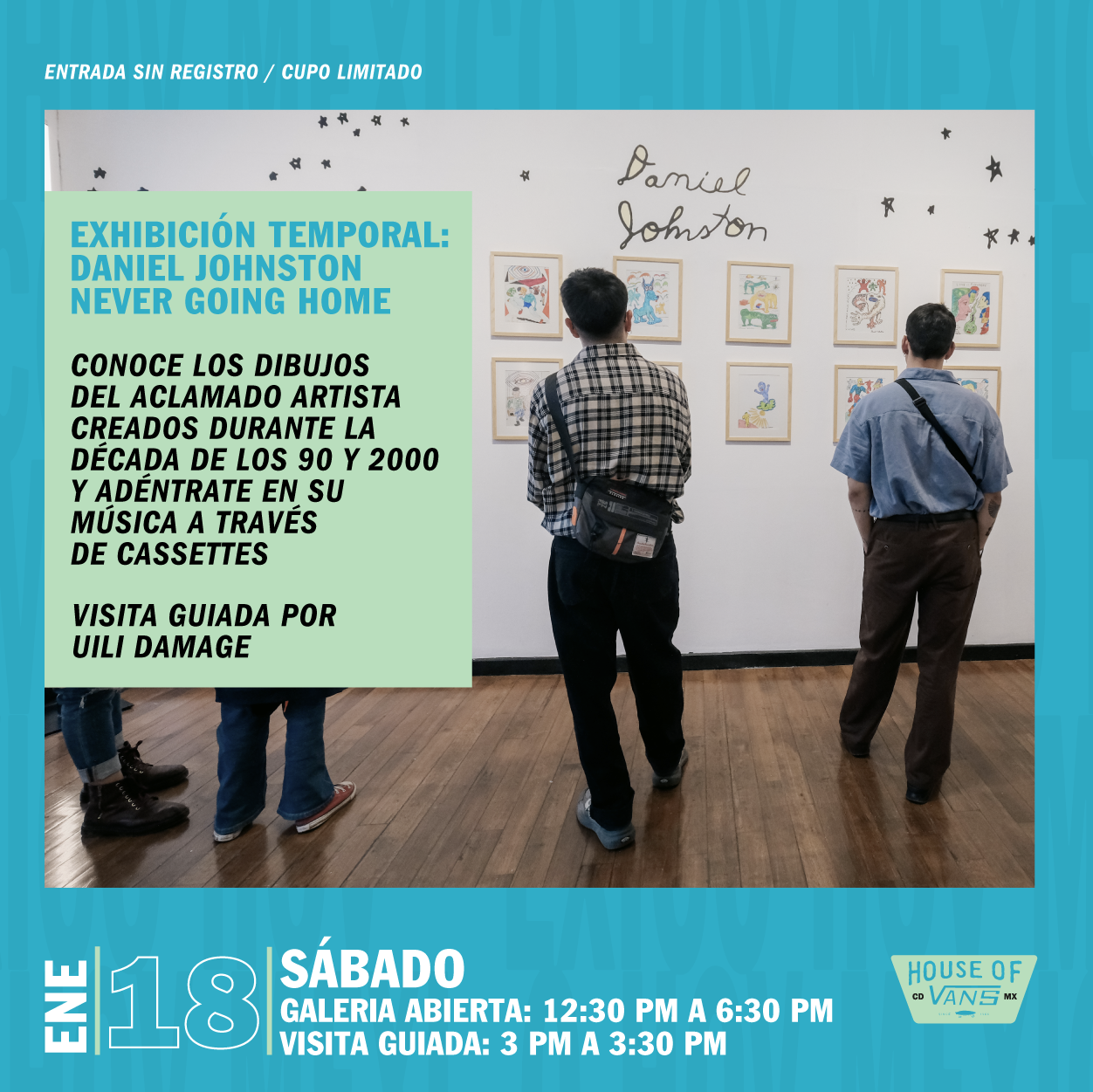 Por primera vez en México, llega la gran exposición «Never Going Home» de Daniel Johnston en la que muestra algunos de sus dibujos que lo llevaron a ser de los artista más importante en la época de los 90 y 2000. Habrá una visita guiada de 15:00 a 15:30 horas, la entrada es libre. Cupo limitado.