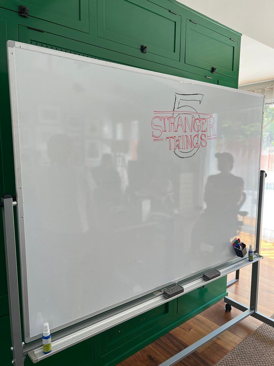 “¿Lo más extraño? Darse cuenta de que todo inicia con un pizarrón en blanco. Stranger Things temporada 5, próximamente”, escribió Netflix en su cuenta de Facebook oficial y junto a este mensaje publicó una foto de un pizarrón blanco que en la esquina superior derecha tiene el logo de Stranger Things, más un cinco en el fondo, dibujado. Esto sigue la línea que han tenido los logotipos de las temporadas 2, 3 y 4 anteriormente.