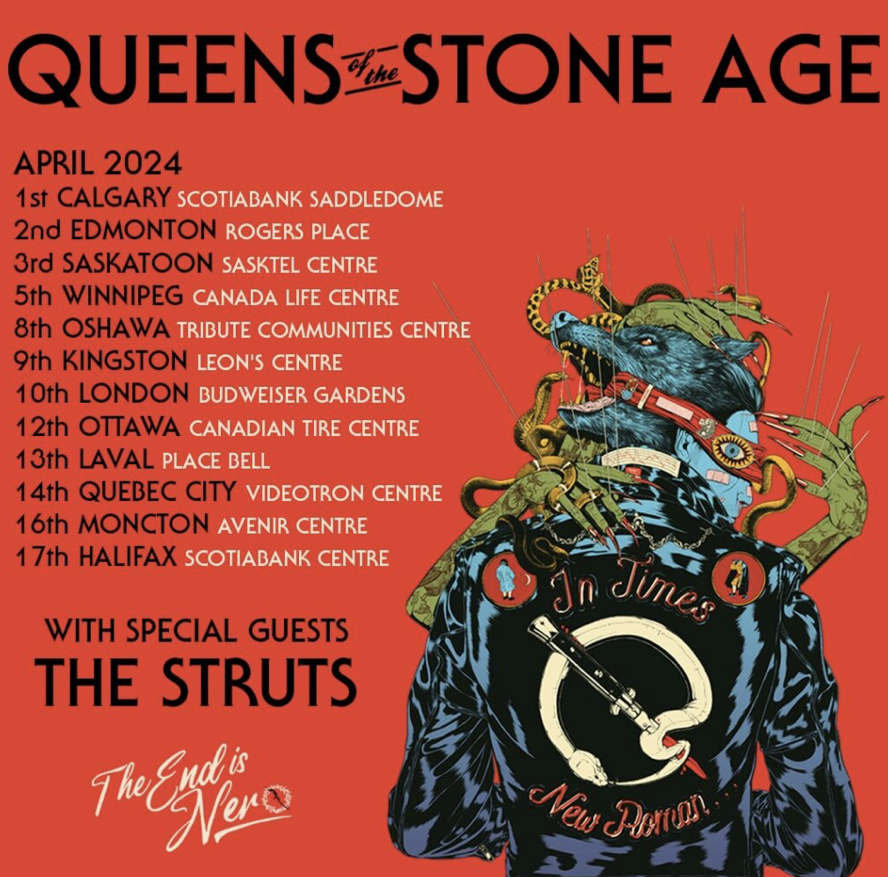 Queens of the Stone Age ha anunciado una serie de fechas de gira para 2024. A ellos se unirán The Struts para un breve recorrido por Canadá. La carrera comienza el 1 de abril en Scotiabank Saddledome en Calgary, Alberta y finaliza el 17 de abril en Scotiabank Center en Halifax, Nueva Escocia.