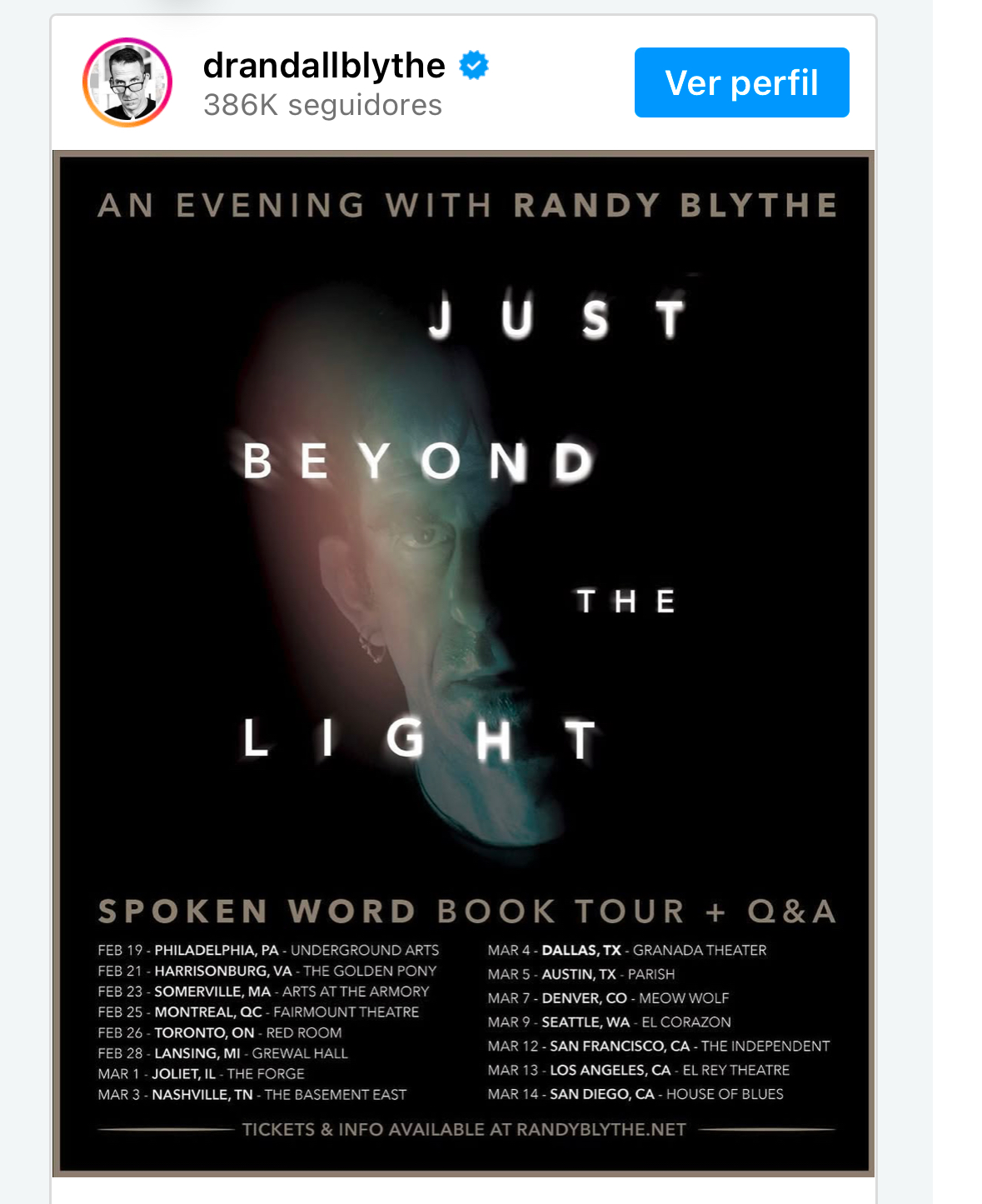 En una publicación de Instagram dirigida a los fans, Blythe explicó que recibió un correo electrónico de un conocido que había comprado entradas y planeaba llevar a su hijo. Blythe le advirtió a esta persona que traer a su hijo no era una buena idea, y continuó aclarando que esta «NO es una gira de presentación de libros normal» en su publicación en las redes sociales. Aunque las veladas contarán con Blythe “leyendo un pequeño extracto en un momento” de su nuevo libro, Just Beyond the Light: Making Peace with the Wars Inside Our Head, que llegará el 18 de febrero (ordene aquí), la mayor parte del tiempo se dedicará a contar historias en un intento de “ilustrar los temas principales del libro”.