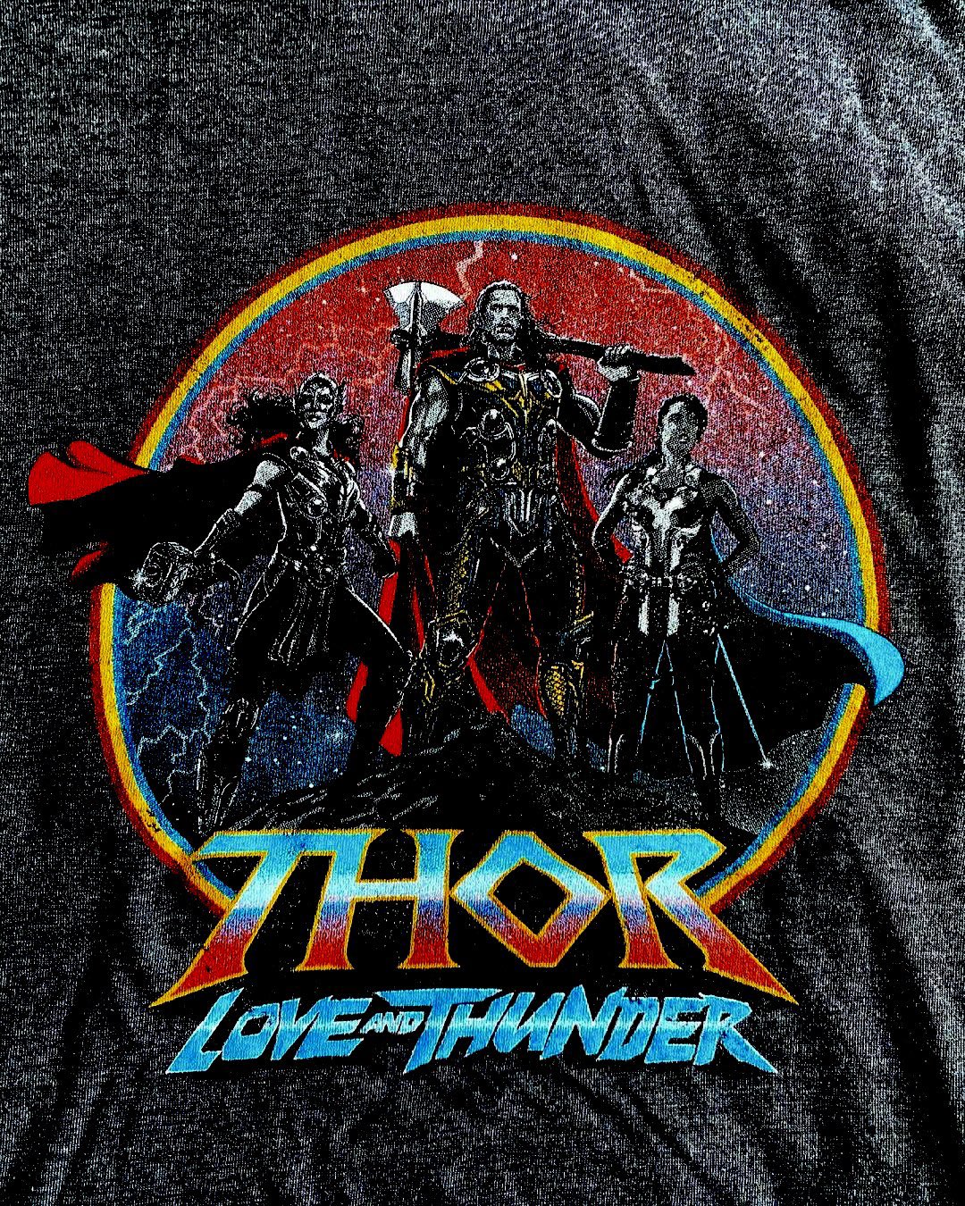 La prenda tiene una impresión que muestra a Thor, Valkyrie y a Mighty Thor de Jane Foster por primera vez con su armadura, casco, capa y sosteniendo el Mjolnir.