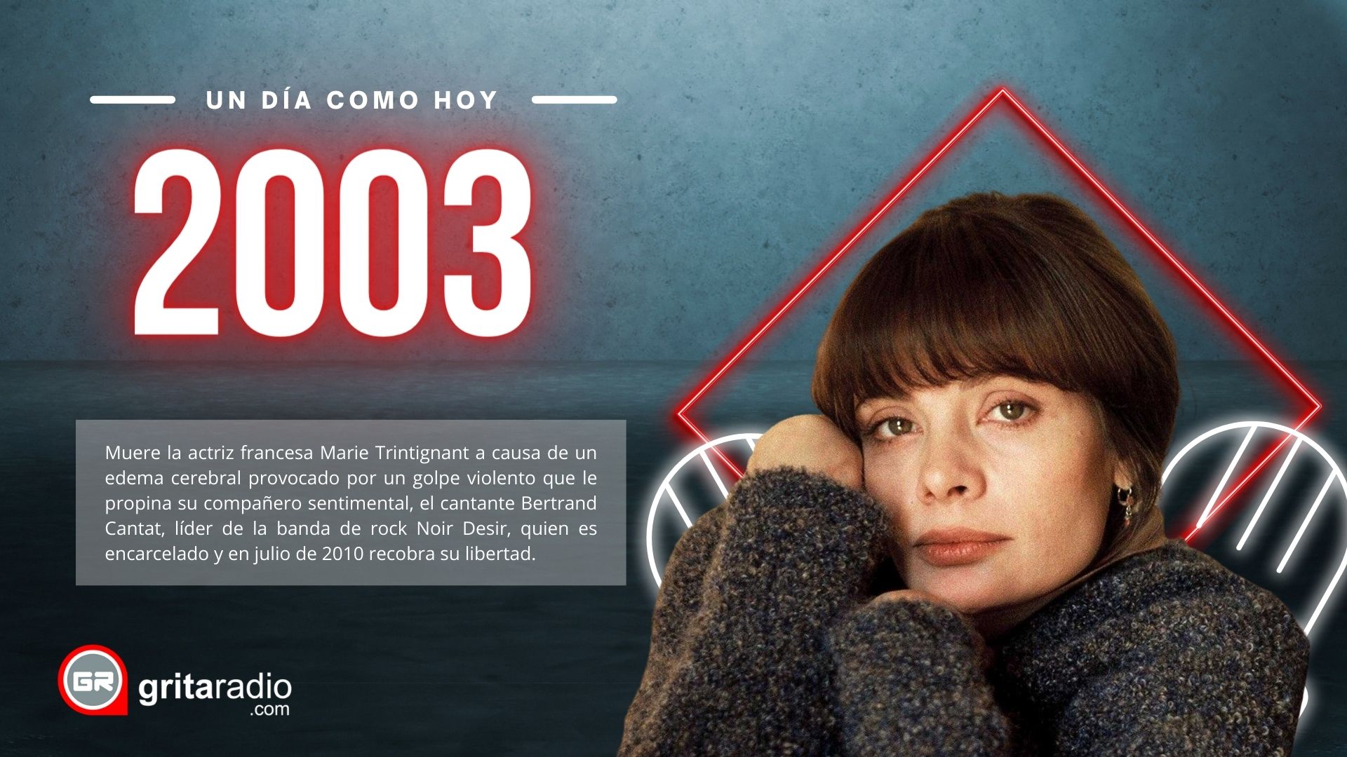 2003.- Muere la actriz francesa Marie Trintignant a causa de un edema cerebral provocado por un golpe violento que le propina su compañero sentimental, el cantante Bertrand Cantat, líder de la banda de rock Noir Desir, quien es encarcelado y en julio de 2010 recobra su libertad.