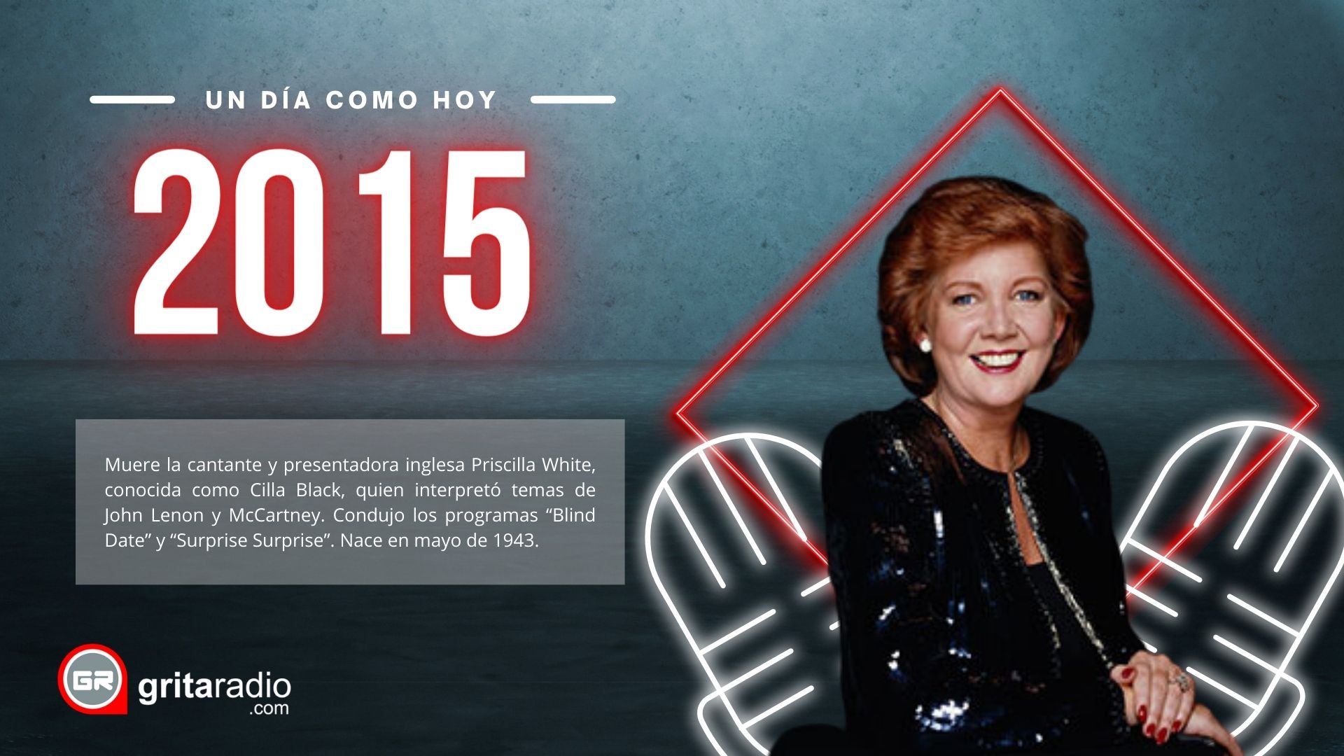 2015.- Muere la cantante y presentadora inglesa Priscilla White, conocida como Cilla Black, quien interpretó temas de John Lenon y McCartney. Condujo los programas “Blind Date” y “Surprise Surprise”. Nace en mayo de 1943.