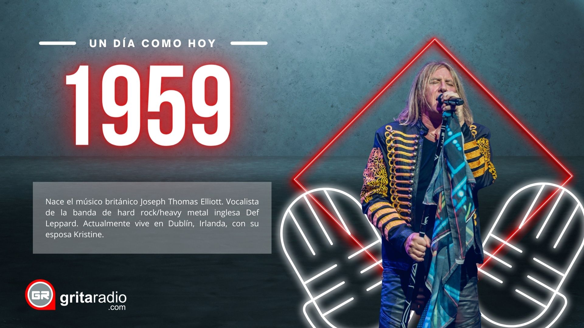 1959.- Nace el músico británico Joseph Thomas Elliott. Vocalista de la banda de hard rock/heavy metal inglesa Def Leppard. Actualmente vive en Dublín, Irlanda, con su esposa Kristine.}