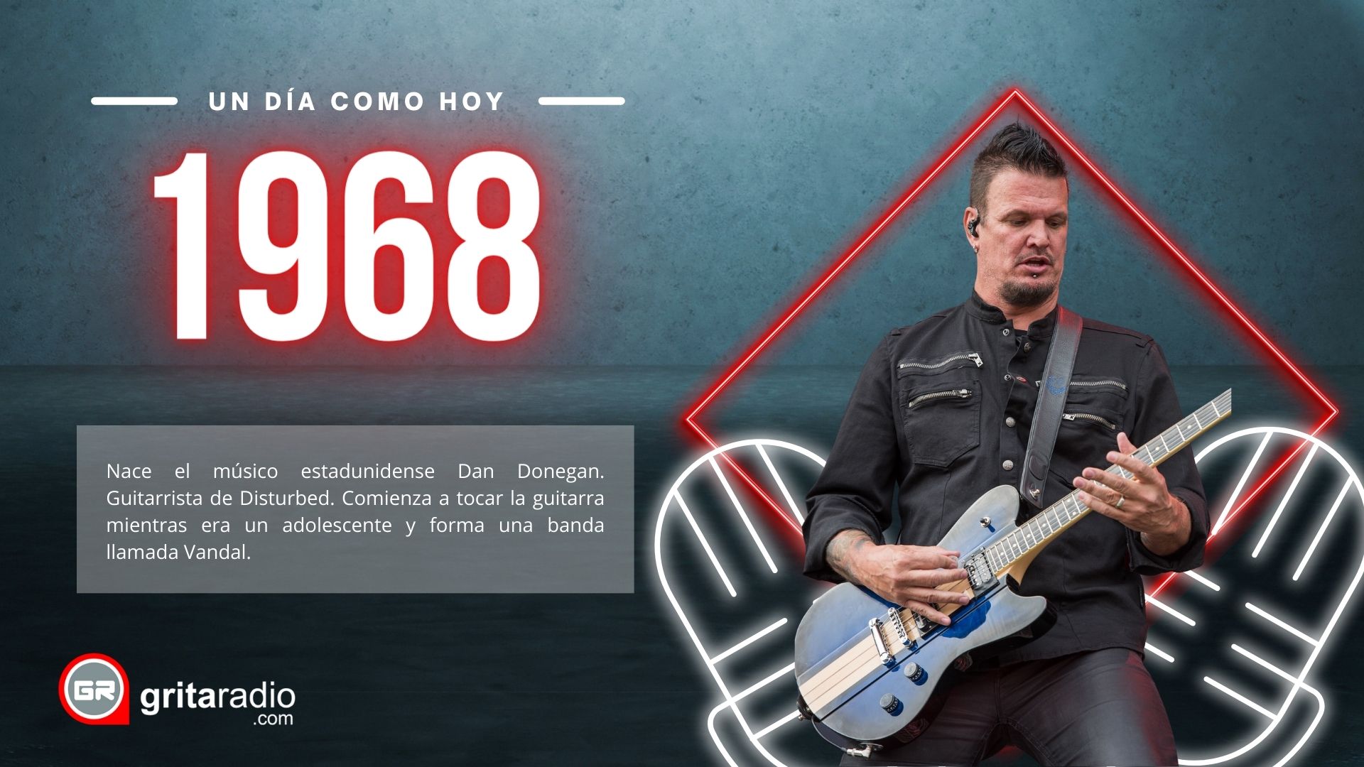 1968.- Nace el músico estadunidense Dan Donegan. Guitarrista de Disturbed. Comienza a tocar la guitarra mientras era un adolescente y forma una banda llamada Vandal.