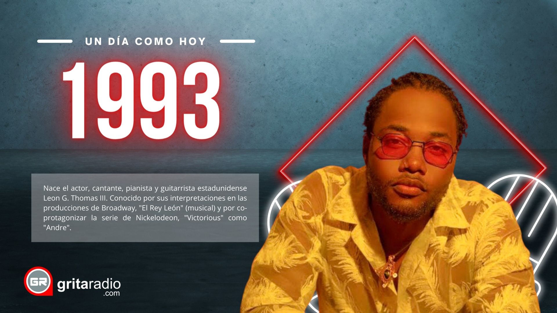 1993.- Nace el actor, cantante, pianista y guitarrista estadunidense Leon G. Thomas III. Conocido por sus interpretaciones en las producciones de Broadway, «El Rey León» (musical) y por co-protagonizar la serie de Nickelodeon, «Victorious» como «Andre».