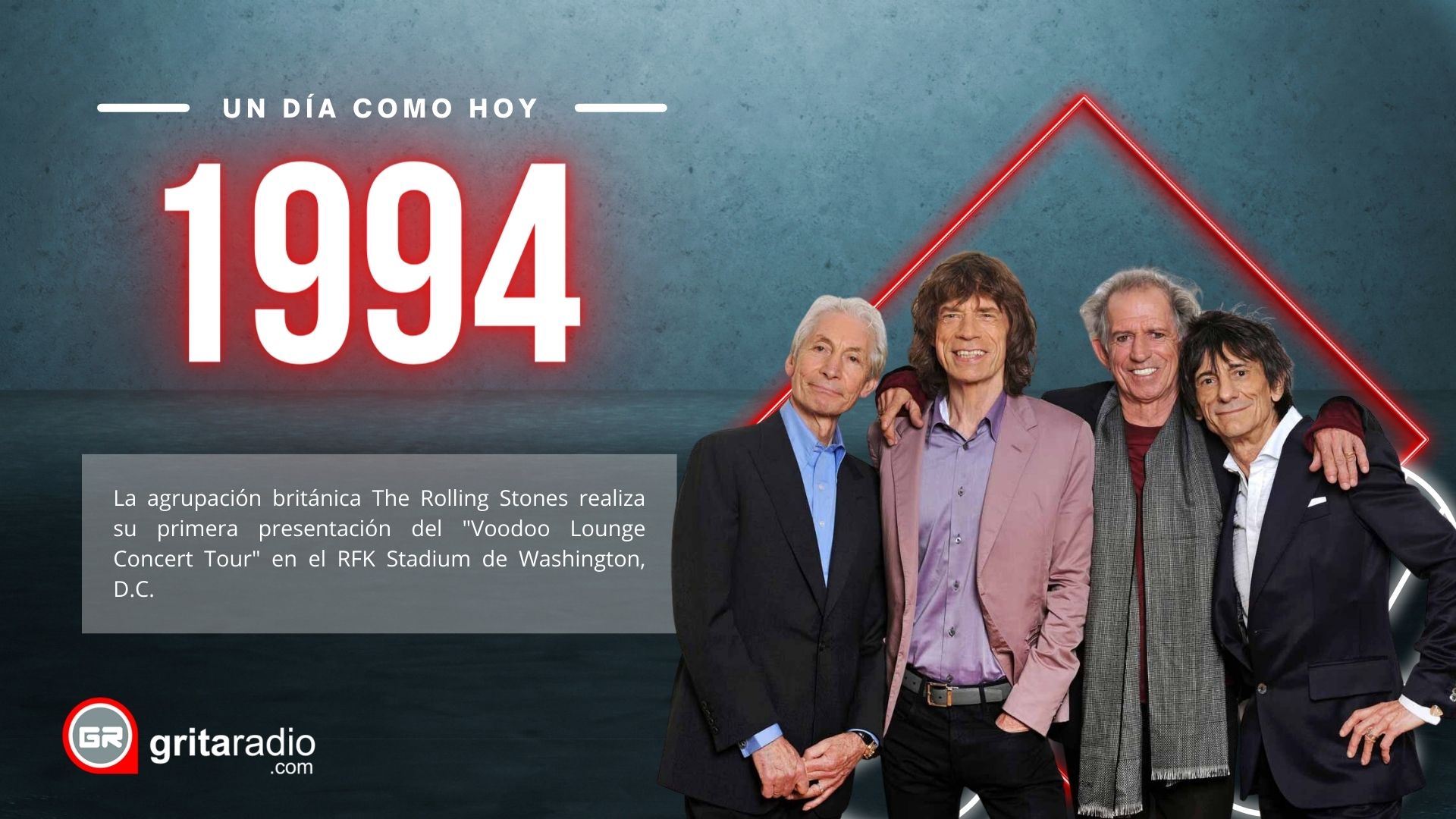 1994.- La agrupación británica The Rolling Stones realiza su primera presentación del «Voodoo Lounge Concert Tour» en el RFK Stadium de Washington, D.C.