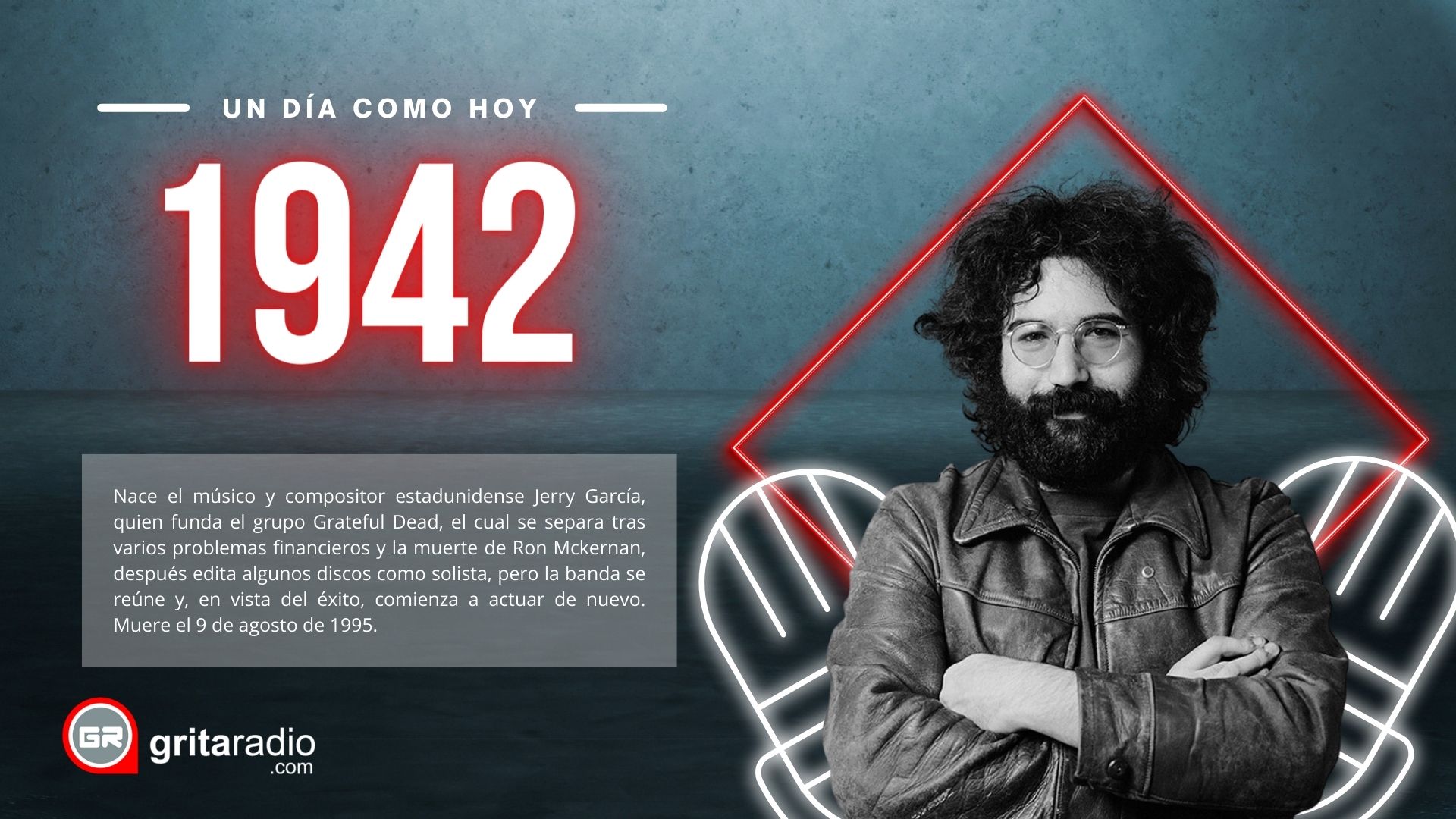 1942.- Nace el músico y compositor estadunidense Jerry García, quien funda el grupo Grateful Dead, el cual se separa tras varios problemas financieros y la muerte de Ron Mckernan, después edita algunos discos como solista, pero la banda se reúne y, en vista del éxito, comienza a actuar de nuevo. Muere el 9 de agosto de 1995.