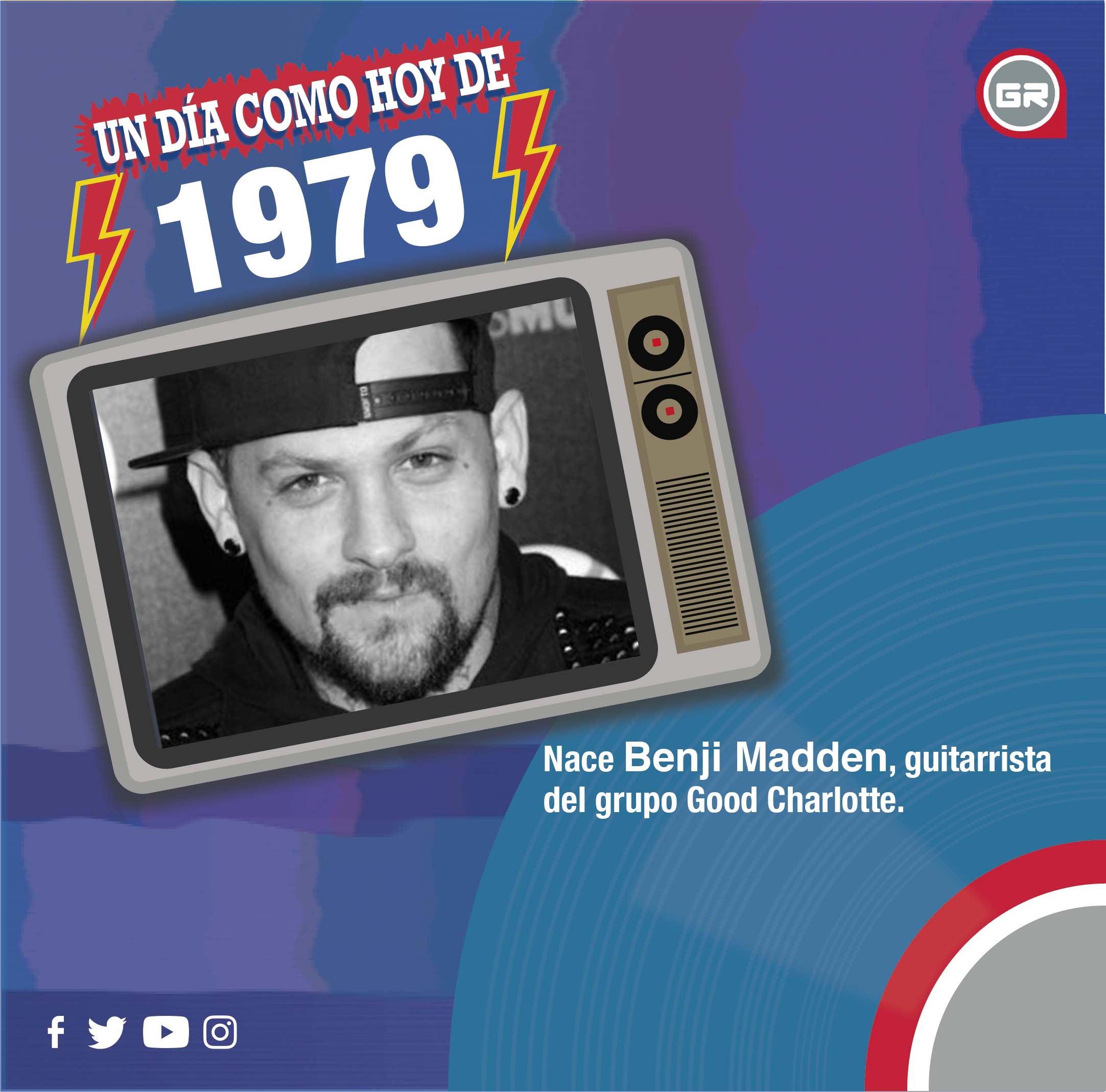 1979.- Nace Benji Madden, guitarrista del grupo Good Charlotte, banda pop punk formada en 1996. Entre sus cortes más populares están «The anthem» y «Girls and boys». El nombre de Good Charlotte lo sacan de un libro para niños escrito por Carol Beach York. Está al frente de la banda con su hermano gemelo Joel.