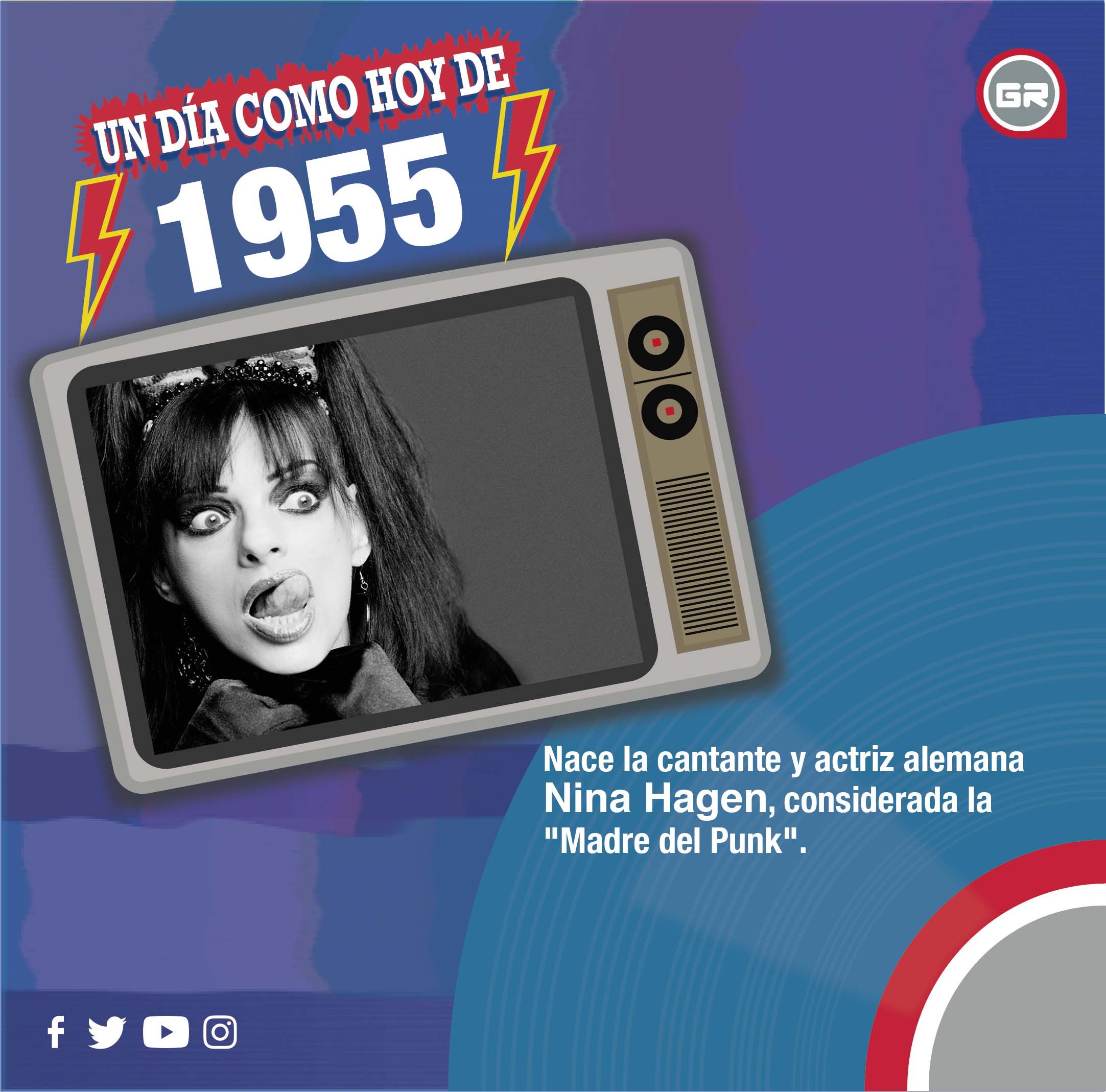 1955.- Nace la cantante y actriz alemana Nina Hagen, considerada la «Madre del Punk». Es intérprete del mundialmente exitoso tema «Universal radio» y escandaliza a la sociedad alemana de su época por las letras de sus canciones.